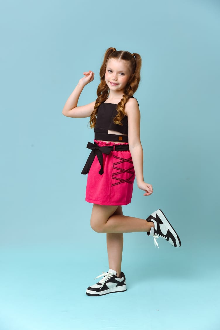 Conjunto shorts saia com shortinho interno em malha e fechamento com botões
