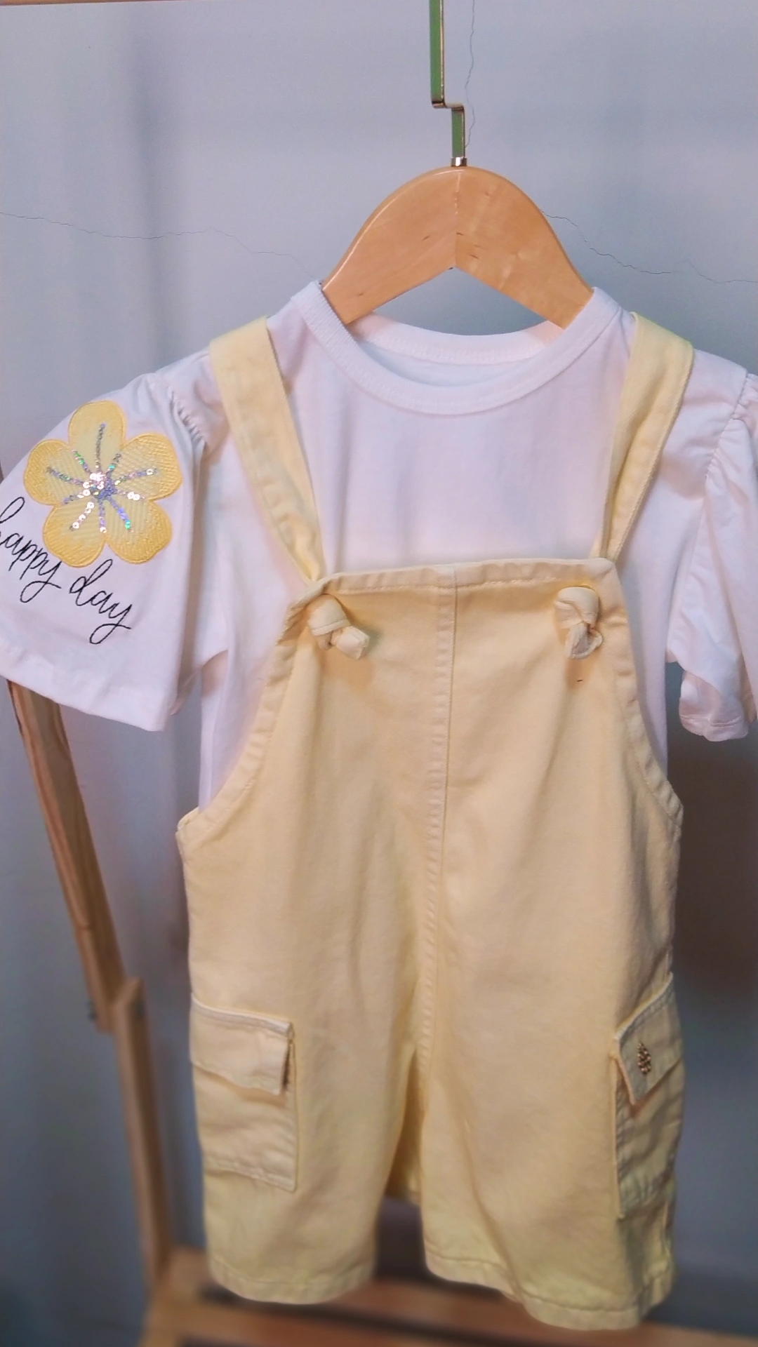 Jardineira + blusa bordada com brilho amarelo