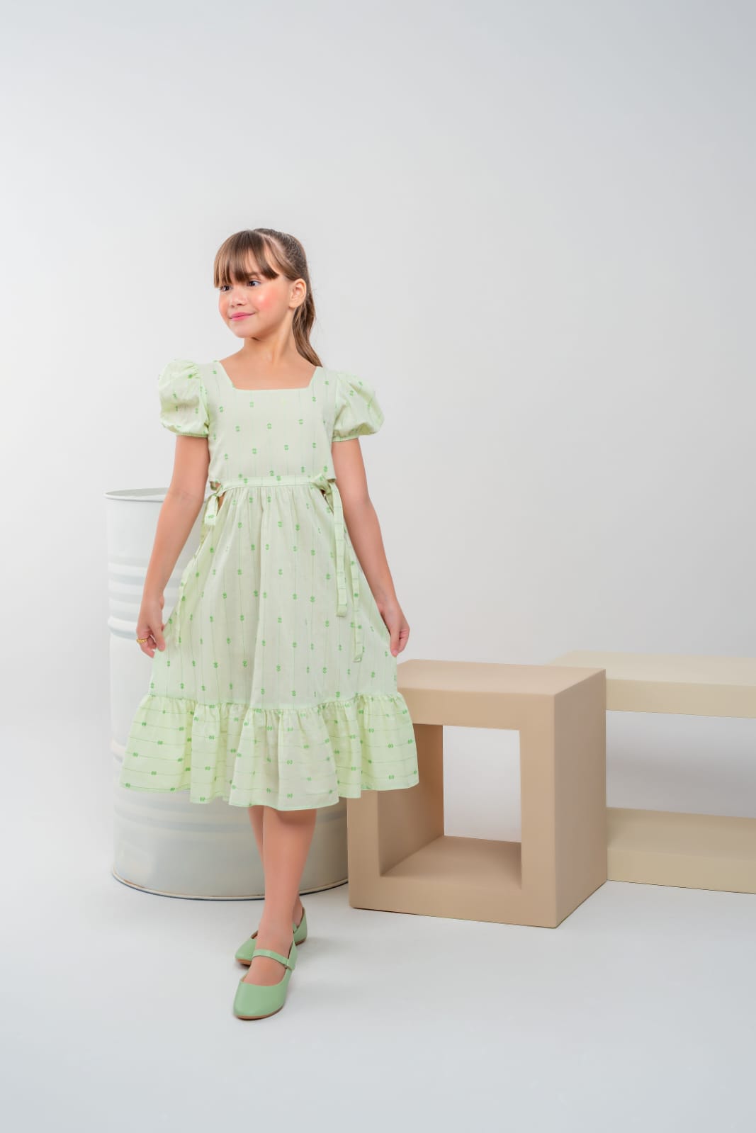 Vestido Midi medio, em tecido trabalhado com pequenos bordados, peça toda forrada